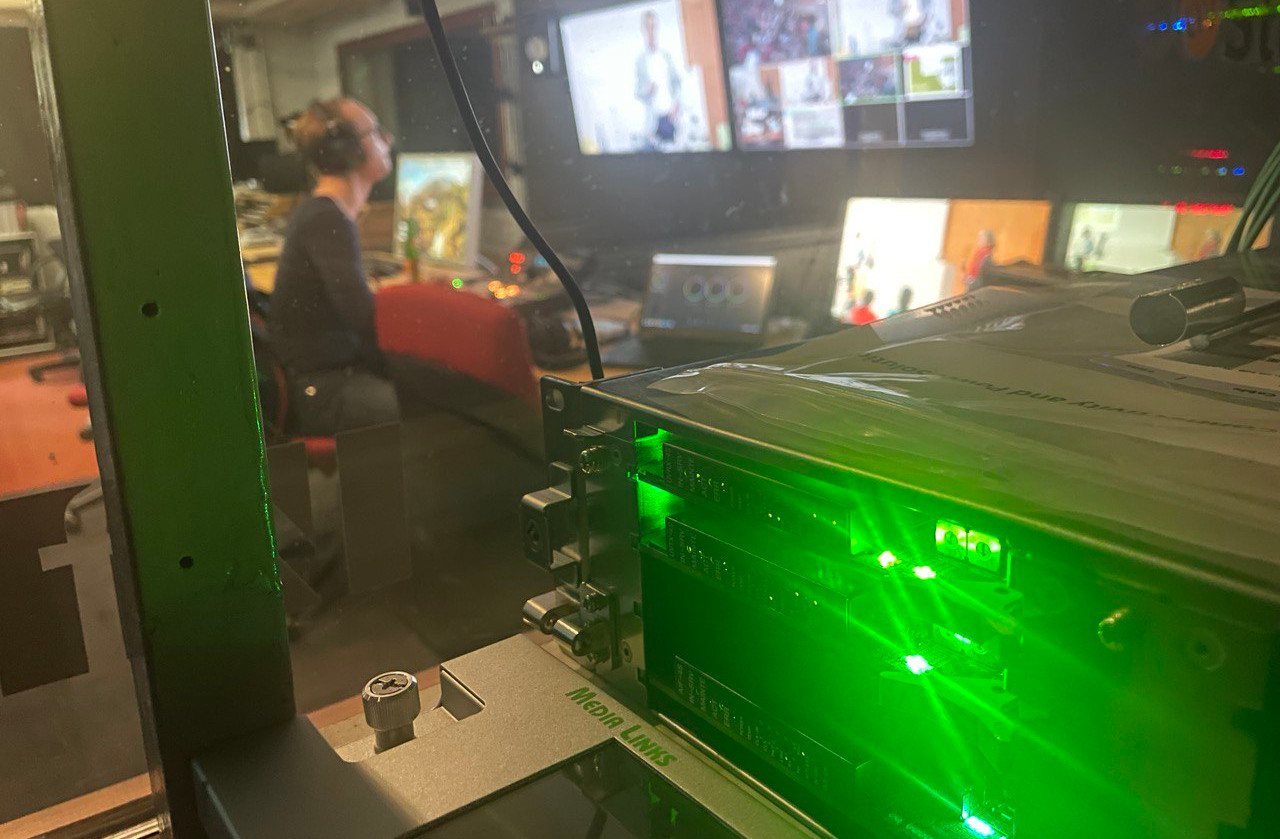 Zum anderen feierten kürzlich gespendete IP-Video-Wandler Premiere und wir konnten zumindest flächen- und gerätechnisch unseren Fußabdruck vor Ort verringern. Die Kameras inkl. der Kameraleute und der Mischer befanden sich zwar vor Ort im Audimax, gemischt und abgeglichen wurden die Signale aber aus unserer Regie in der Zimmerstraße. Die dafür notwendigen Geräte der Firma MediaLinks wandeln unter anderem koaxiale SDI Signale4) in einen IP-basierten Standard um5), welcher dann problemlos über Standard-Netzwerkinfrastruktur übetragen werden kann. Wir verwendeten die Inputs unkomprimiert, wären also bei der vorhandenen 10Gbit/s Leitung auf 6x 1,5G Signale begrenzt gewesen. Um auf Nummer sicher zu gehen, war aber unser Studio mit einer Notfall-Regie noch vor Ort und es wurden nur das Signal des Multiviewers, ein PGM und ein AUX-Signal in die Regie übertragen. Außerdem war noch der Ton und die Produktions-Interkom im Programm-Signal eingebettet. In die andere Richtung (Regie -> Audimax) sendeten wir zwei weitere Videostreams, zum einen um eine visuellen Kommunikation im Falle eines Interkom-Ausfalls zu ermöglichen und zum anderen um die Stabilität weiter zu testen. In Bezug auf die dabei auftretenden Datenraten fielen die zusätzlichen Steuerdaten für den Videomischer (lediglich einige kbit/s), gar nicht weiter auf. In vorherigen Tests lag die Latenz bei nur etwa 2-3 Halbbildern in der Sekunde, dementsprechend werden wir dann vermutlich bei der nächsten Orchesteraufführung auch den Videomischer bei uns in der Regie lassen, sodass sich wirklich nur die Kameraleute am Produktionsort befinden.
