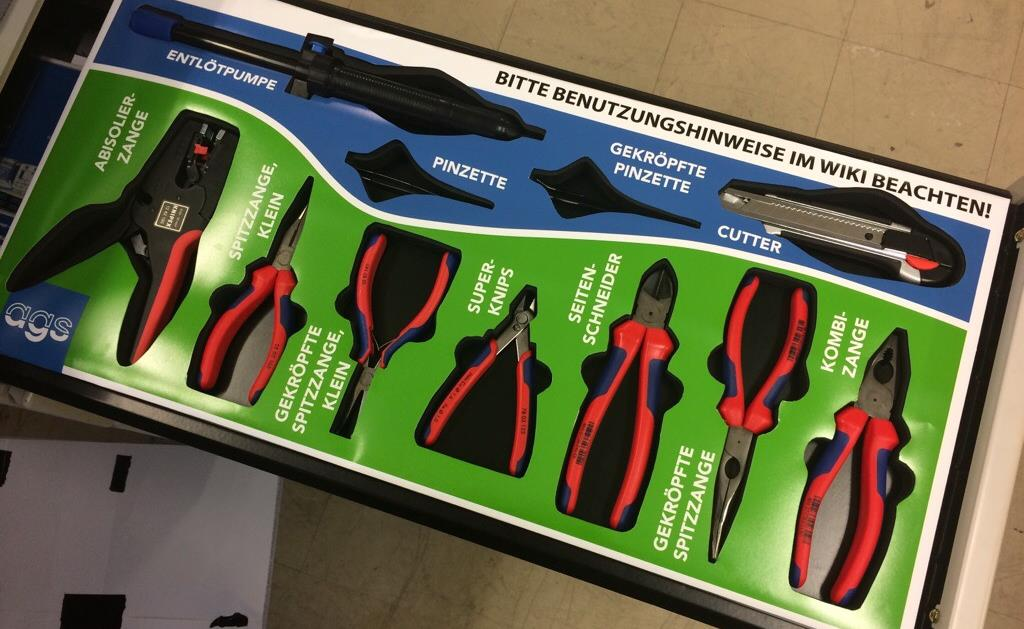 Vor bereits einiger Zeit haben wir aus Studienbeitragsmitteln vier neue Werkzeugsets für unsere e.lab Arbeitsplätze beschaffen dürfen. Diese Anschaffung nahmen wir zum Anlass das etwas in die Jahre gekommene Ordnungssystem in unserer elektronischen Werstatt zu erneuern und verbessern.