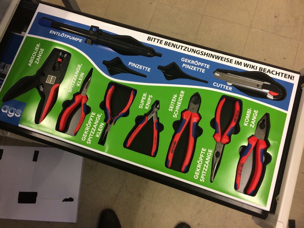 Vor bereits einiger Zeit haben wir aus Studienbeitragsmitteln vier neue Werkzeugsets für unsere e.lab Arbeitsplätze beschaffen dürfen. Diese Anschaffung nahmen wir zum Anlass das etwas in die Jahre gekommene Ordnungssystem in unserer elektronischen Werstatt zu erneuern und verbessern.