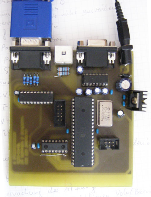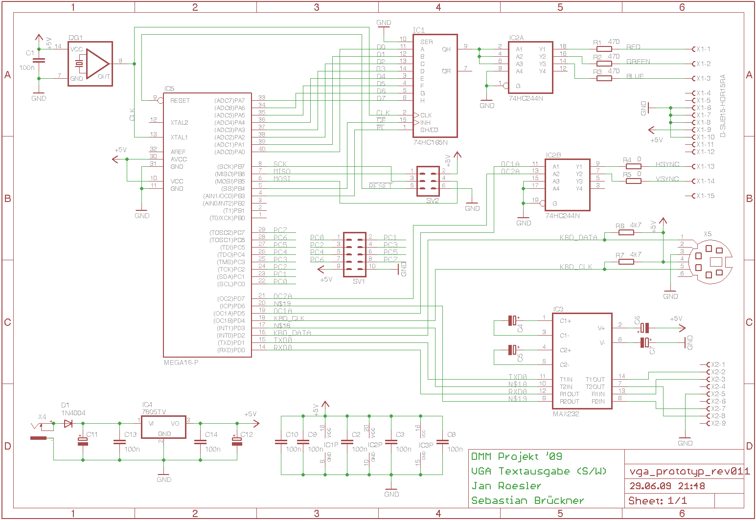 Der verwendete ATmega644P Mikrocontroller erzeugt ein standardkonformes S/W VGA-Signal mit 640×400 Pixeln bei einem Pixeltakt von 25 MHz. Der Mikrocontroller wurde dazu von 20 auf 25 MHz übertaktet, es werden je 8 Pixel parallel ausgegeben und von einem 74HC165 Schieberegister serialisiert.
