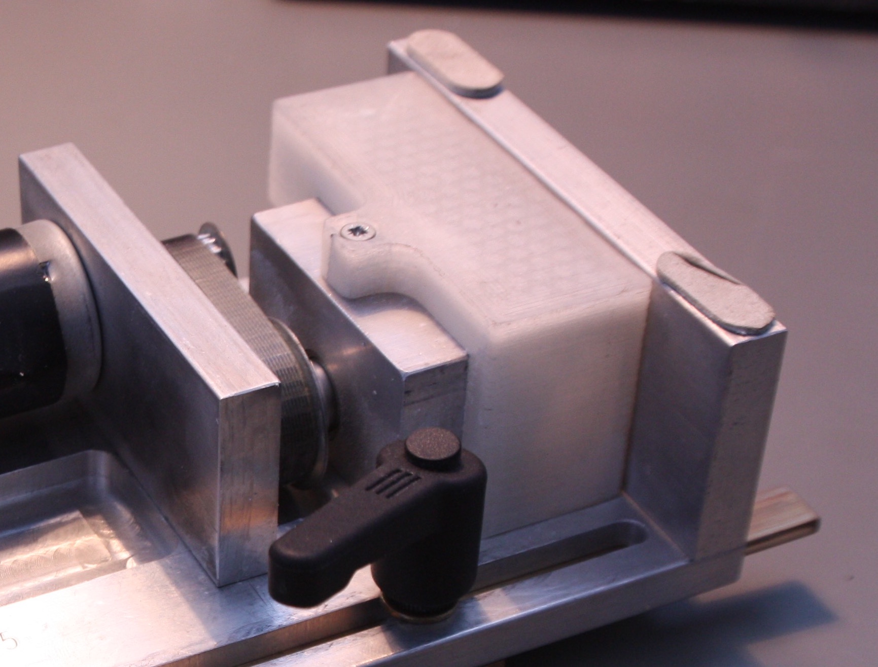 Da die Stäube beim Sägen von Platinen nicht unbedingt lungenfreundlich sind, besitzt die Säge eine Staubabsaugung. Hierzu sitzt ein 3D-gedruckter „Siffon“ unter dem Sägeblatt, der ein Schlauchanschluss hat, an dem ein Staubsauger angeschlossen werden kann. Das zugehörige Druckteil ist weiter unten bei den Downloads zu finden.